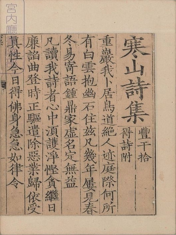 此《寒山诗集》为唐代著名高僧、诗人寒山撰,寒山子擅长写白话诗。全书共一卷,附丰干、拾得诗,约三百余首,书前有朱晦庵与南老帖、陆放翁与明老帖。此为日本宫内厅书陵部藏,南宋时期刊本(国清寺系统传本、蝴蝶装)。