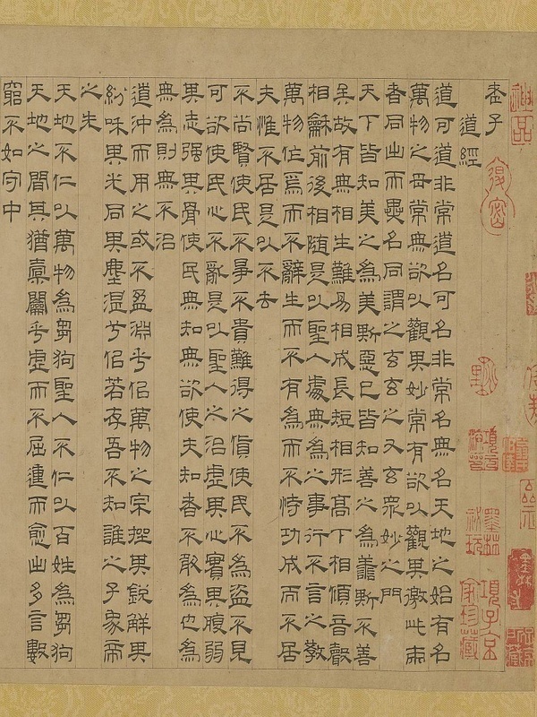 《老子授经图》[1] 左下角落元盛懋款,说明此卷当时以画而收藏,但经考证此款系后添,非盛氏手笔,而在后纸胡子昂题跋中也未提及此图,只论吴叡书法,可见此经卷应为吴叡隶书之佳作。此书作于元元统三年(1335 年),吴氏时年三十八岁。吴叡传世书法作品较少,《道德经》为其隶书代表作,结体整齐工稳,字形大小一律,笔法方圆互用。虽有汉隶规模,而实依唐隶风范,五千言文字一气呵成,且无一懈笔,功力可观。清乾隆《秘殿珠林续编》著录。(介绍参考:李艳霞)