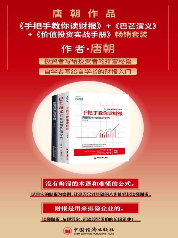 雪球网人气用户教你轻松读懂财报 以一份真实的财报为案例 告诉你如何探知财报背后的企业秘密 没有晦涩的术语、没有难懂的公式 前两章完整地阐述了老唐个人对投资的全部理解,其主要框架来自以格雷厄姆及巴菲特为代表的投资大师们数十年的无私分享。老唐的贡献主要是按照自己的理解与实践,用简单、通俗易懂的语言,将大师的思想体系转化为任何具有初中文化水平的读者都能理解的文字。力争让读者读后,彻底明白价值投资必然获利背后的逻辑及所需的条件,并完全扭转对股价波动尤其是向下波动的恐惧。